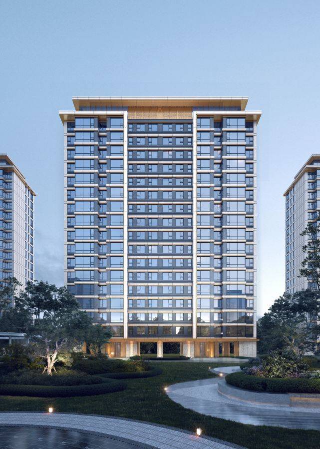 项目外立面设计上,立面利用大面积玻璃+阳台落地窗+金属型材+层间装饰提升建筑整体感和精致度,顶层外挑飘板使得建筑立面体块清晰,层次丰富。