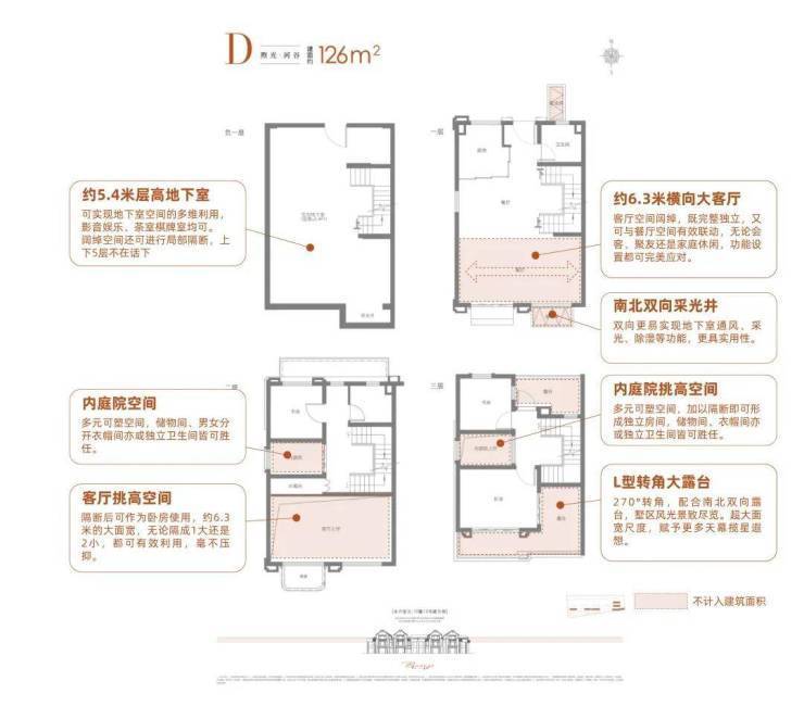 约5.4米层高地下室,纵享大尺度空间,加上大面积挑高可塑方案,可挑战N个126㎡的实用极限。