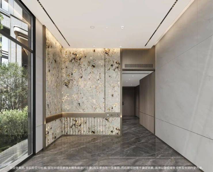 高定地下入户大堂,延续首层入户大堂材质高标,精选雪山银狐天然透光奢石,营造精奢生活质感。