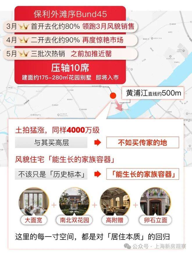 杨浦滨江风貌带全新供应,约500米滨江+臻稀风貌+超级花园,保利·外滩序BUND45在首开去化约80%,领跑3月全上海风貌销售榜后,保利·外滩序Bund45风貌于4月再度入市,去化约90%。