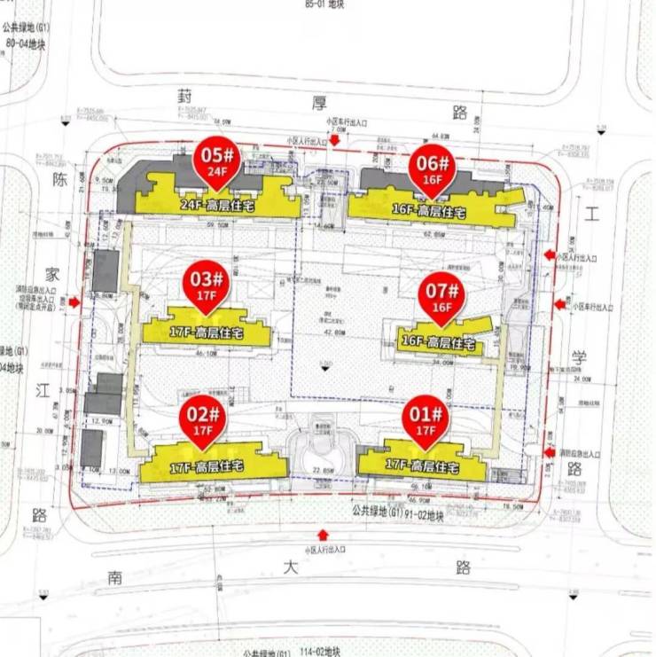 根据设计方案显示,该地块拟建5幢16-17F高层住宅、1幢24F高层住宅以及若干社区配套用房,共计规划约436户。