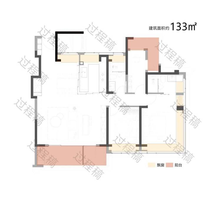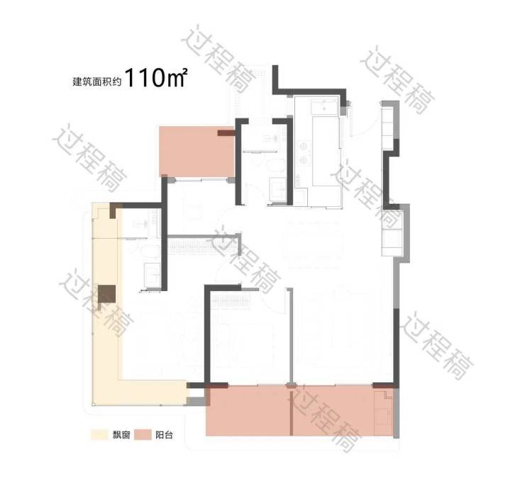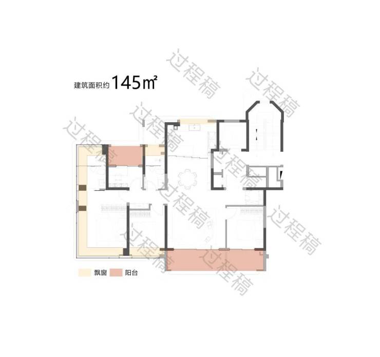 户型配备大面积飘窗(浅米色区域)和阳台(浅粉色区域),飘窗可引入柔和的自然光线,提升卧室等空间的明亮度;阳台则进一步拓展了采光面,同时有利于空气流通,保障室内通风效果,让空间更显通透舒适。