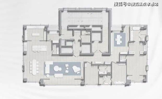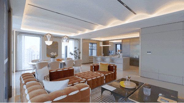 该户型呈三梯一户的设计,同样是约3.6米的奢阔层高,朝南横向跨度超37米,会客厅面宽超18.5米,空间奢阔;户型东、南、西三面全景玻璃幕墙,超270度环幕视野景观震撼!