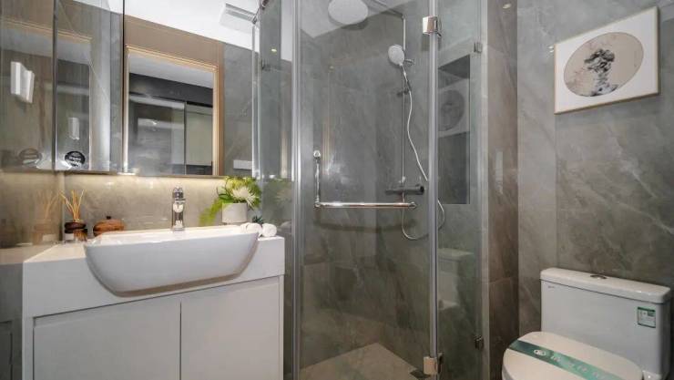 卫生间采用科勒(或同等品牌)的淋浴房、镜柜,日本伊奈(或同等品牌)的马桶、台盆、龙头和淋浴花洒,以及奥普(或同等品牌)的浴霸,品质感十足!