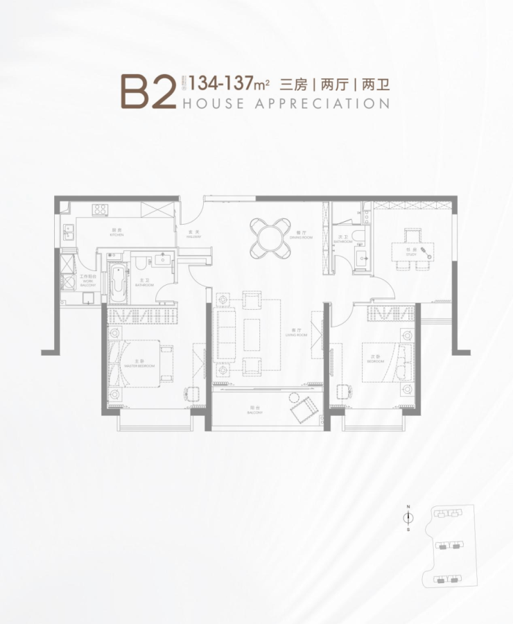 B2户型 建面约134-137㎡ 3房2厅2卫