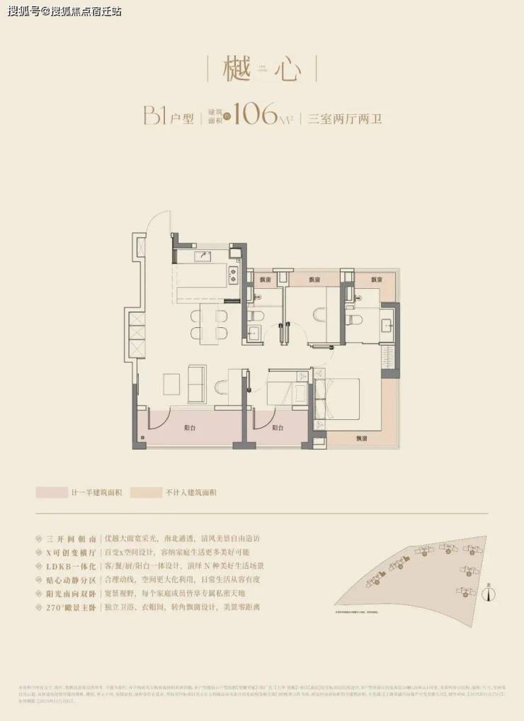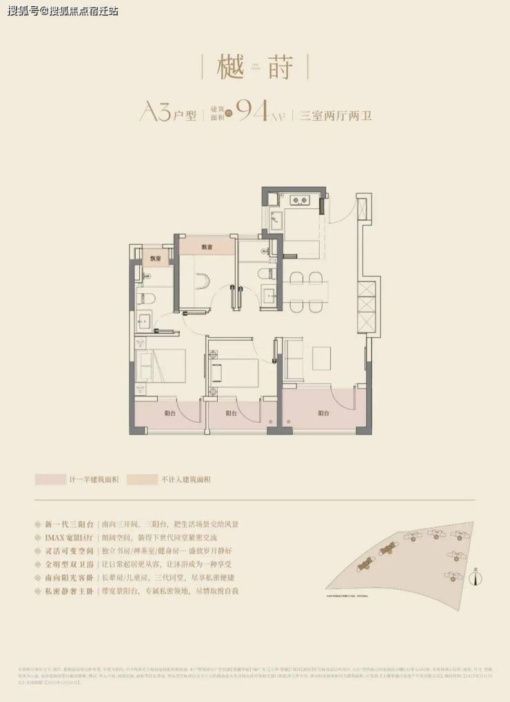 大华望樾建面约94㎡高层户型居然做到了三阳台的配置,远远超过新规标准。