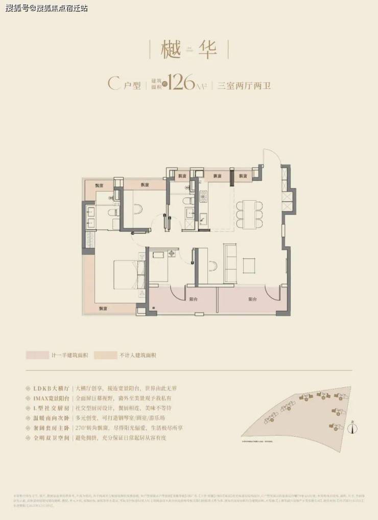 建面约128㎡户型则是双阳台+6飘窗的配置。要知道项目户型飘窗有可能采用非承重结构,交付后可改造为储物空间或拓展室内面积。