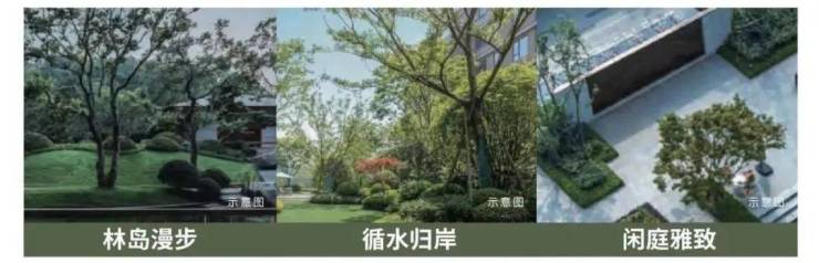林岛漫步围绕中央景观,以现代艺术手法,打造森林岛屿景观循水归岸呼应外部天然水系,内部设置特色水景,串联不同节点闲庭雅致以树木、水系与局部连廊体系融合,共同组建起社区与居所之间的联通介质。