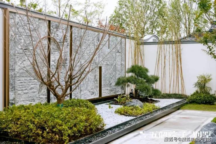 入口右侧是迎宾的组合造景,选用泰山石组景以及黑松、砾石等中式元素,和小区整体江南水乡风格相得益彰.