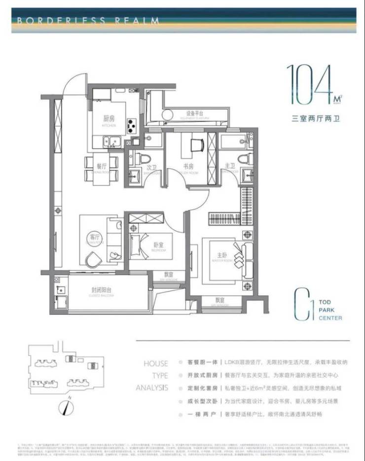建面约104m²户型特点:LDKB洄游式竖厅+开放式厨房,生活尺度无限拉伸,主卧近6m²灵感空间,承载更多功能可能,成长型的次卧,书房儿童房随心所欲。