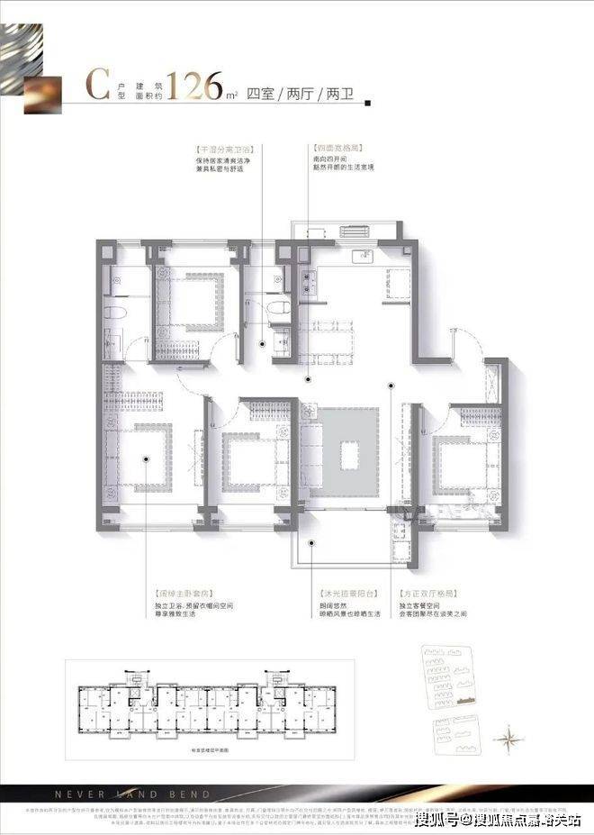 该户型做到了同面积段罕见的四开间朝南+四房设计,南向IMAX级景观面,卧室阳光满溢,功能性也拉满。
