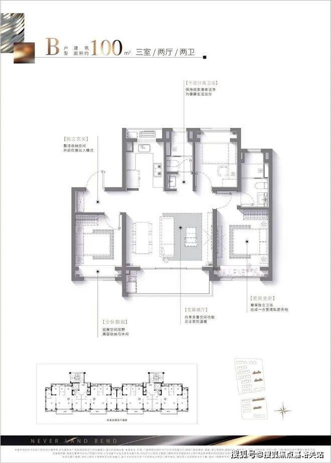 项目建面约100㎡3房2卫仍然是优秀的飞机户型,但实现该面积段少见的大面宽横厅设计