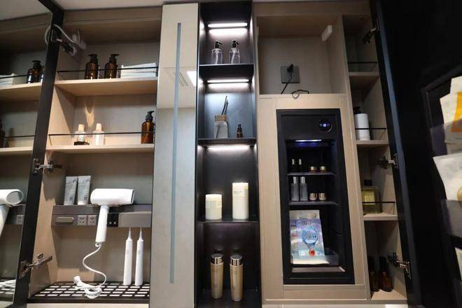 整面墙的镜柜,内部配备了美妆冰箱+门板收纳架+轨道式置物架,储物空间打造的非常充足。