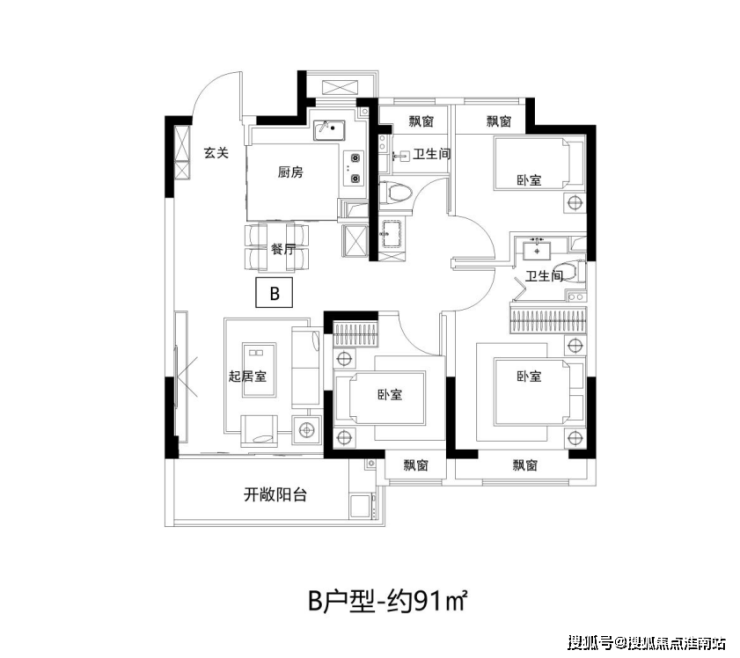 建面约91㎡3房2卫,三开间朝南,客餐厅连通大阳台, 四飘窗设计,好户型该有的素质它都有。
