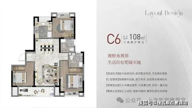 C6户型、建面约108㎡,三房二厅二卫