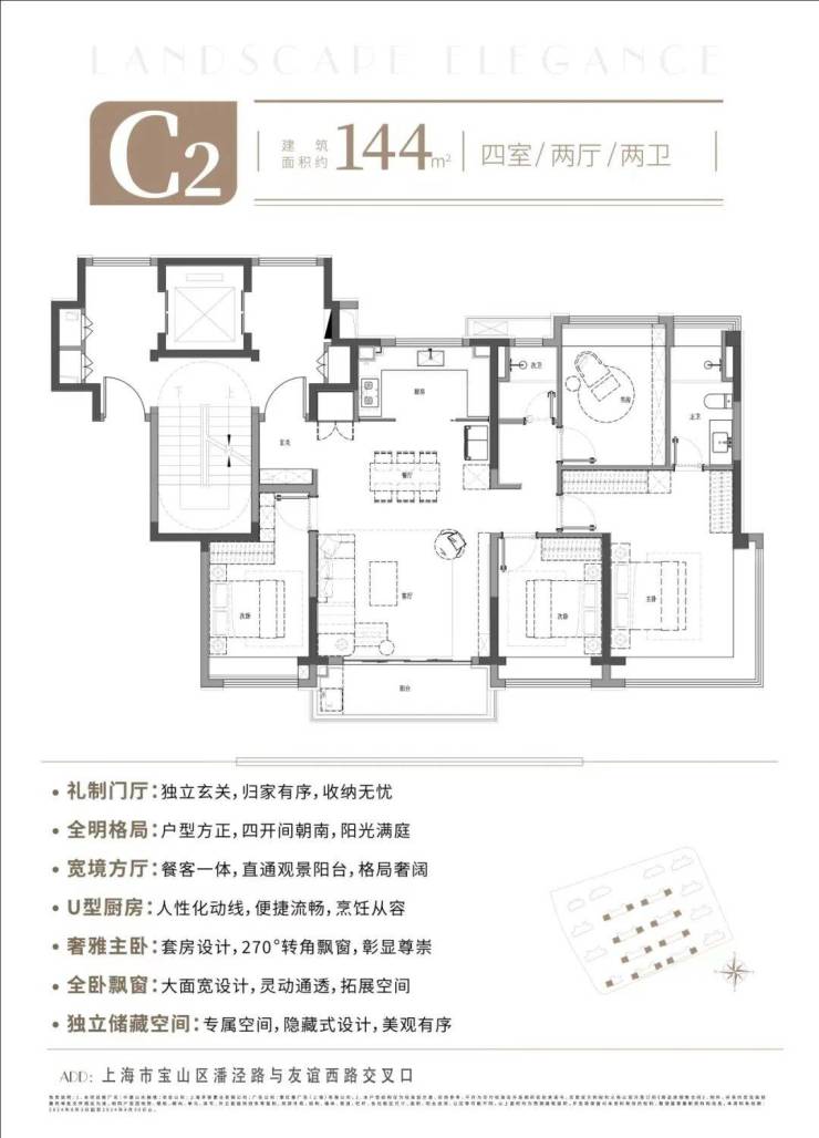 大尺度聚合方厅,为全家人打造陪伴高能的欢聚场;U型厨房,与一体化客餐厅、宽景阳台贯通,令家居动线更开阔流畅;奢雅主卧套房,270°转角飘窗视野,主人品位与格调尽情绽放;隐藏式独立储藏空间,可更轻松、有序收大件物品