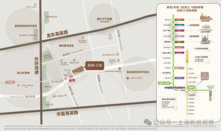 交通方面,该地块算是唐镇地铁上盖项目,与2号线唐镇站直线距离约200米,南侧紧贴着高科东路。通过2号线,2站金科路站,3站张江高科站,9站陆家嘴。