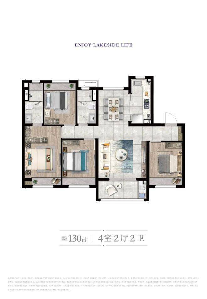 预算充足的小伙伴可以一步到位建面约130㎡4房,南向四开间超大面宽,飞机户型、南北通透,尤其客厅面宽,即使二胎一起玩耍空间也足够了;玄关设计也避免了“一眼看穿”的尴尬。