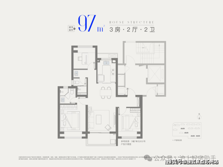 建面约97㎡3房2卫,升级版大3房,入户玄关+主卧套房设计,整体私密性更强,空间更为宽敞。