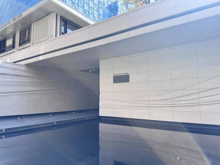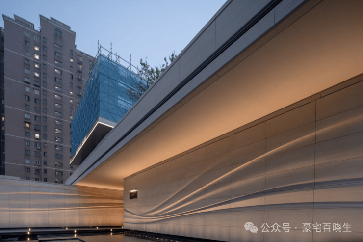 稍微走近一点就能看到采用了大量的弧形元素和石材材料。石材的质感本身就厚重,在上面叠加类似海浪的线条弱化了厚重感,反而显得轻盈。