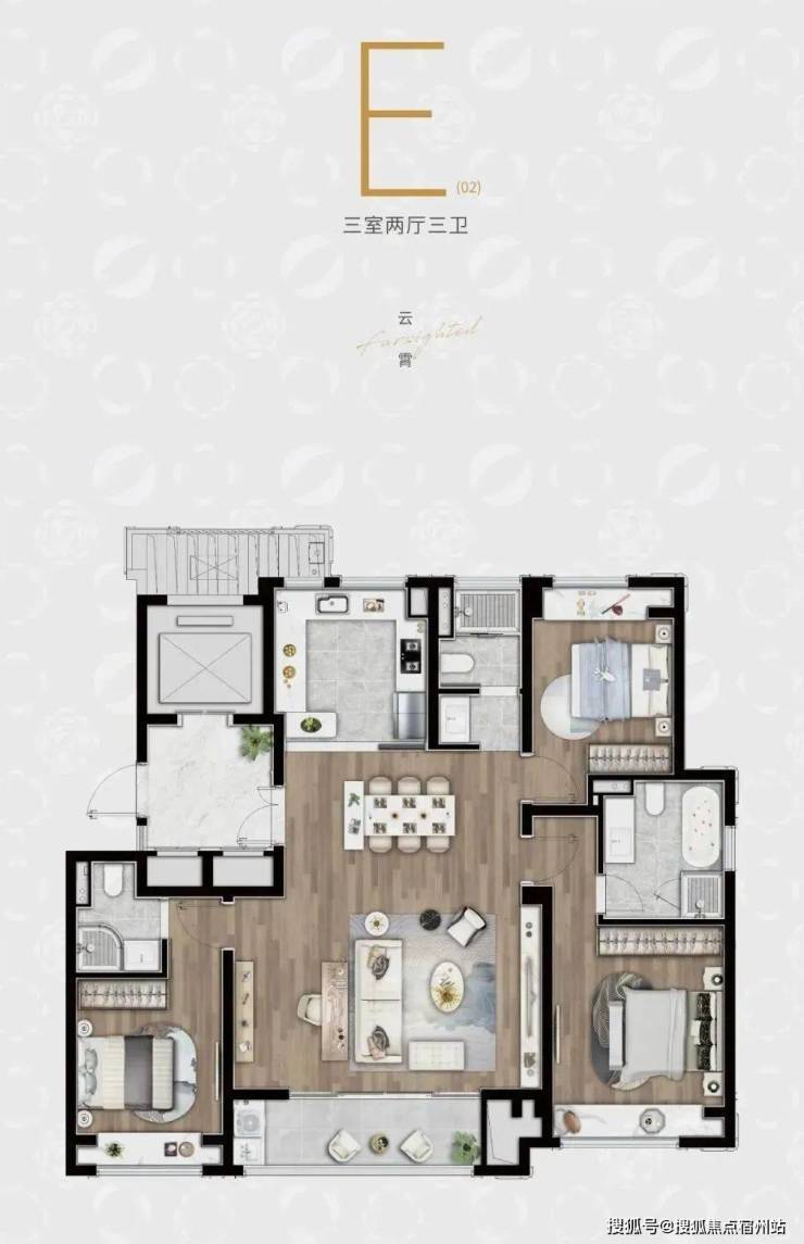 E户型:建面约140㎡3房2厅3卫▼