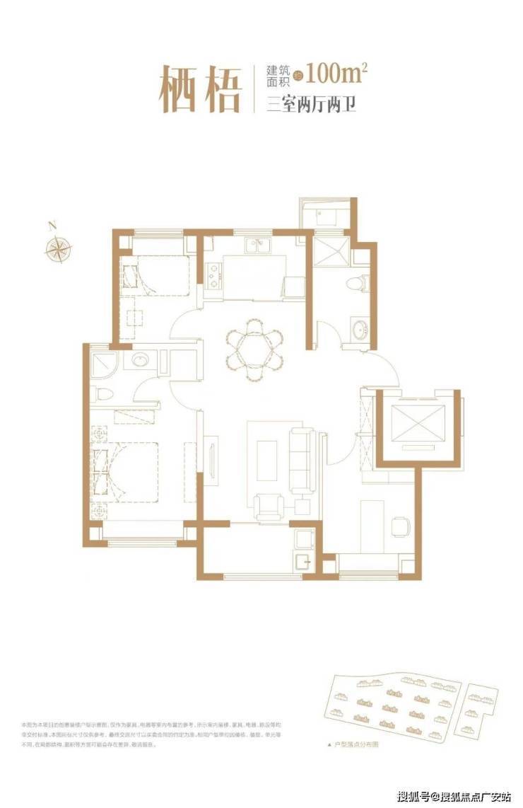 建面约100㎡户型3室2厅2卫▼