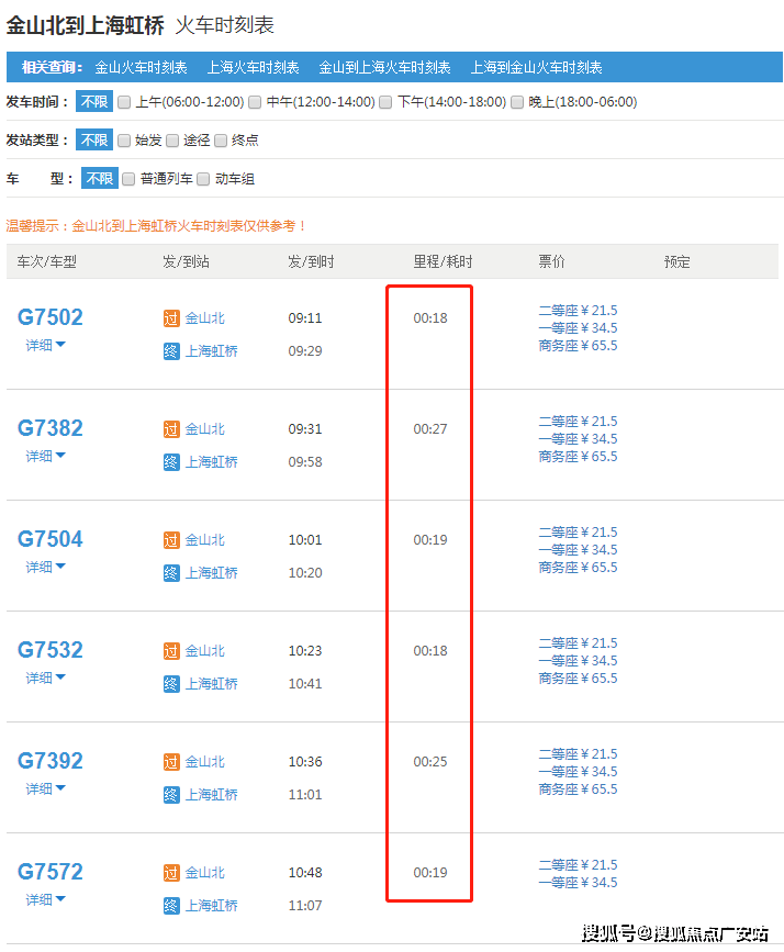 查询火车时刻表可以看到,金山北站到大虹桥核心枢纽只有1站,通勤时间远远低于十几站且站站停的地铁。