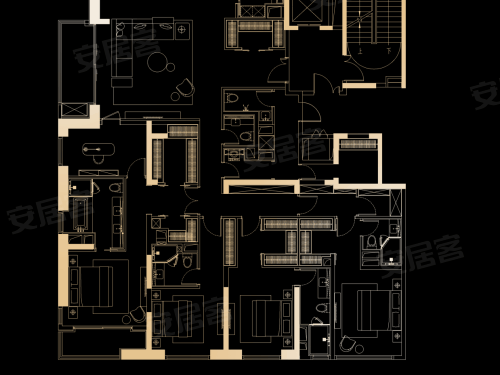 217㎡ 三房:四梯三户,客厅面宽 4.5 米,主卧带独立衣帽间、卫浴。