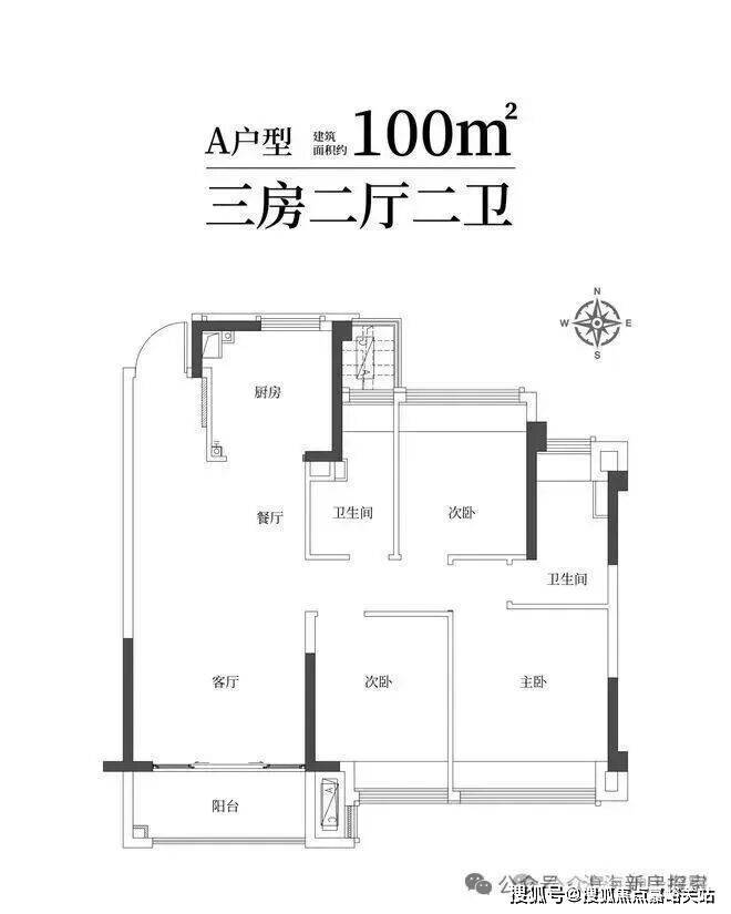 建筑面积约100㎡雅致三房两卫,满足二娃时代