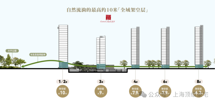 架空层的高度:采用全架空层,最低6.3米,最高10米,将整个社区抬升到豪宅应有的高度。同时,首层不同主题的景观庭院,也获得了更加穿透的视觉效果,地面层也变成了独属于业主的私人定制花园。