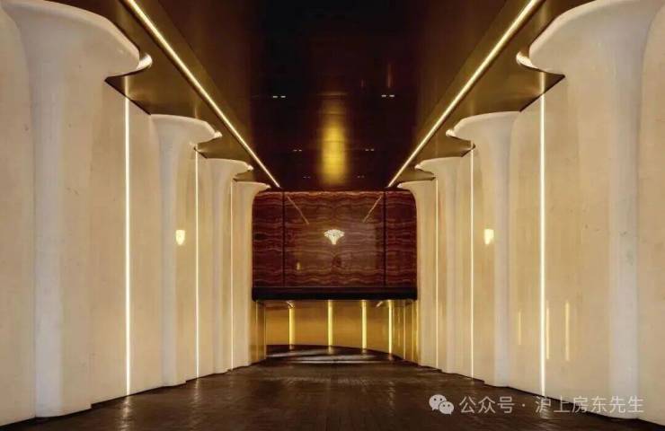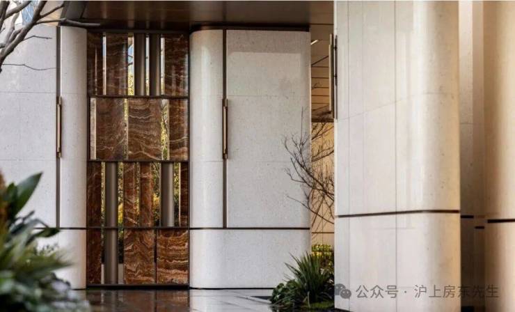 6、社区含“奢材”量很高。门庭延街的外立面,以精工定制弧形米色石材为主调,镶嵌典藏级老虎玉大理石,点缀古铜色现代海派艺术感灯器,整体呈现出百年海派的贵雅气质。