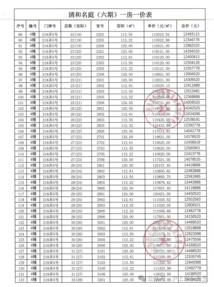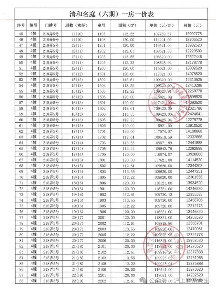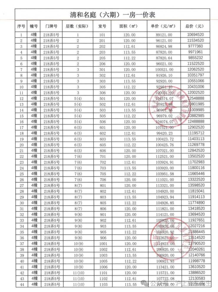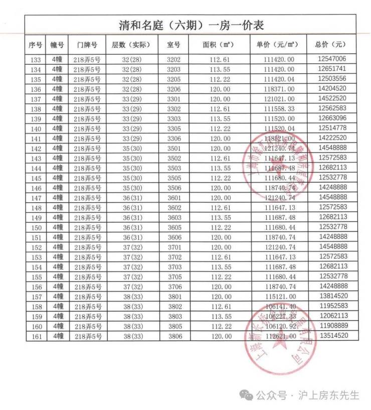 一房一价表如下