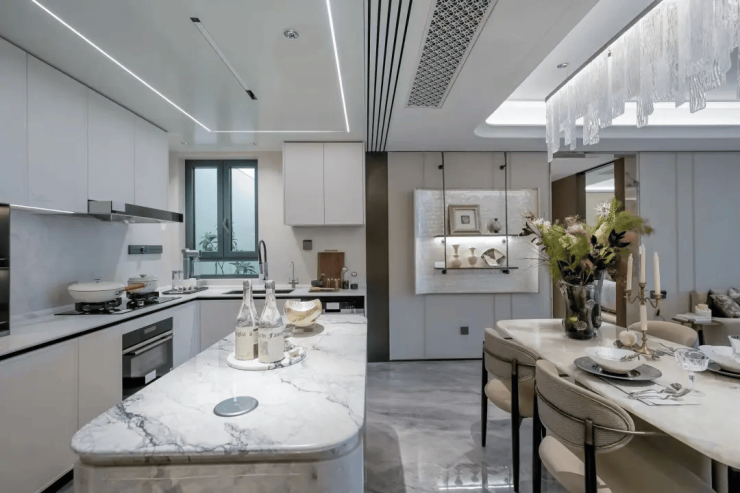 前所未及的超大尺度,结合曲面的艺术设计,使得整个室内的居住品质得到了质的飞跃!功能区的设计也充满了人本的细节设计和思考,阔朗的超大厨房设计,定制岛台,升降式插座,实现大家族式的社交式烹饪。
