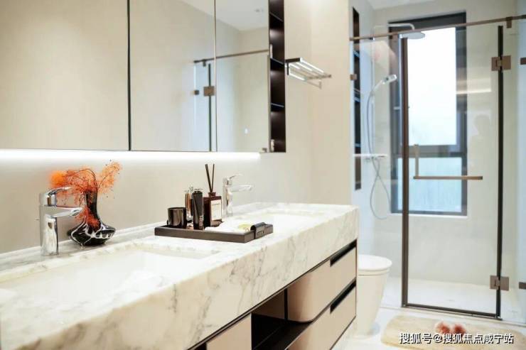 主卫配置市场价5位数以上的科勒全智能马桶,高仪的龙头花洒,定制防雾镜柜,还贴心的设置了大容量的美妆冰箱,恒温存储化妆品,如此高标堪比五星级酒店般的体验。