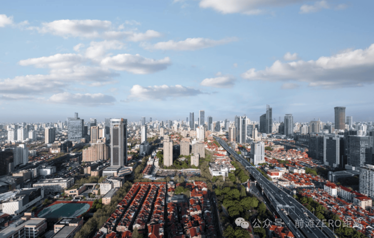 西眺:衡复老洋房肌理蜿蜒,静安寺金顶、中山公园摩天轮勾勒魔都天际线。