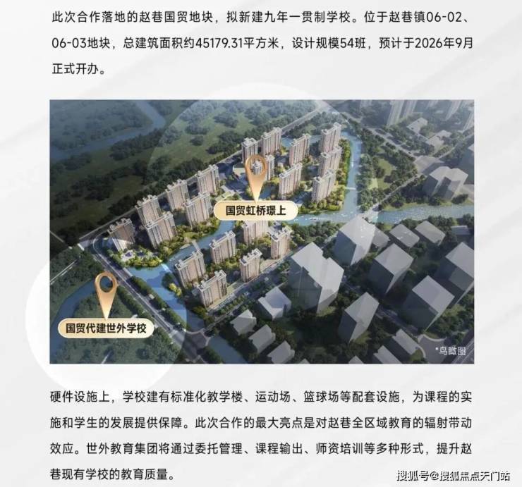 9月5日“世外”正式官宣落定赵巷,这所世外托管的公办九年制学校为国贸代建学校,与项目仅一路之隔,未来大概率对口。(期房不承诺学区,学区划分以教育局公布为准)。