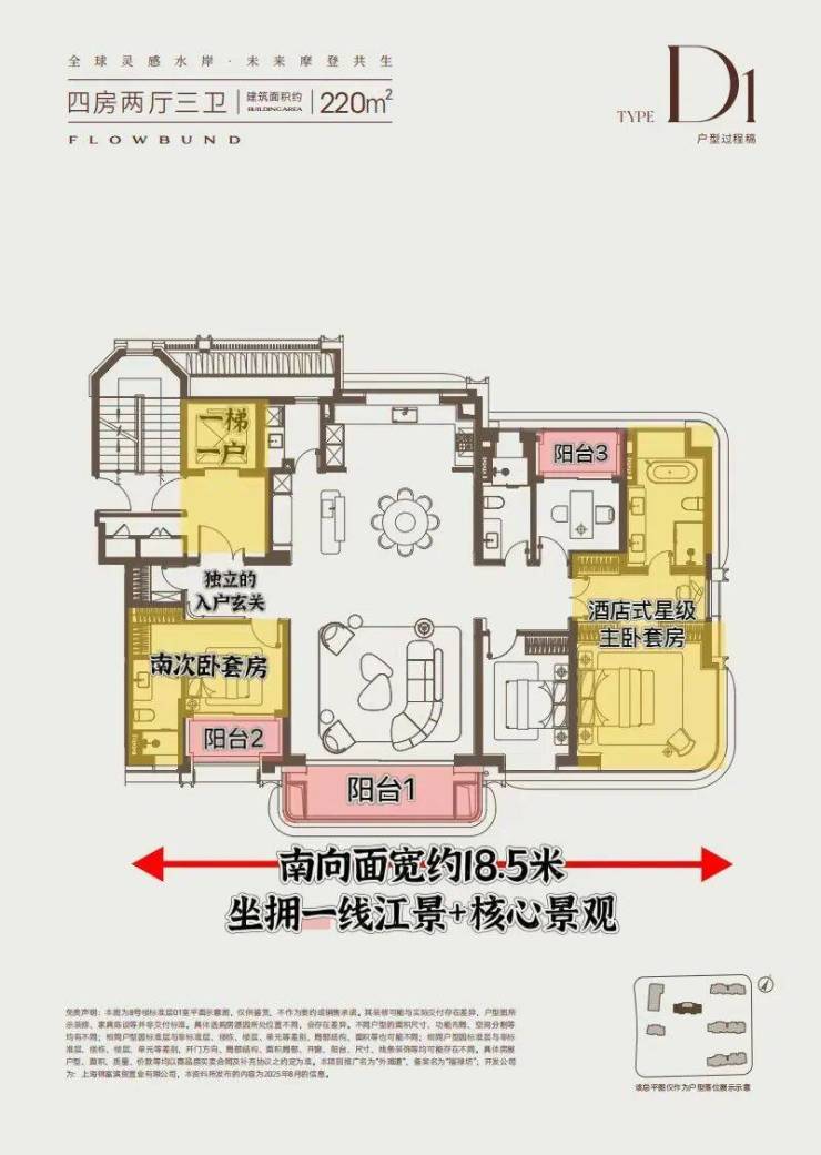 标配一梯一户,真正独立的电梯厅空间,增加了至少5-8个平方的可利用面积;三开间朝南+南向双阳台+大横厅的设计,户型格局方正,通风采光与视野完美;主卧套房设计,步入式衣帽空间+干湿分离主卫,尺度奢阔。