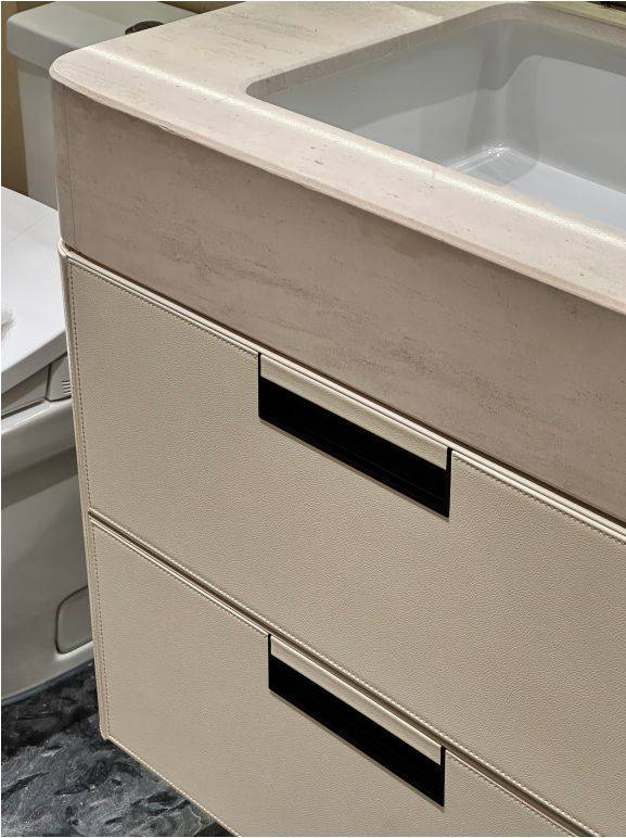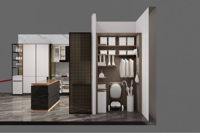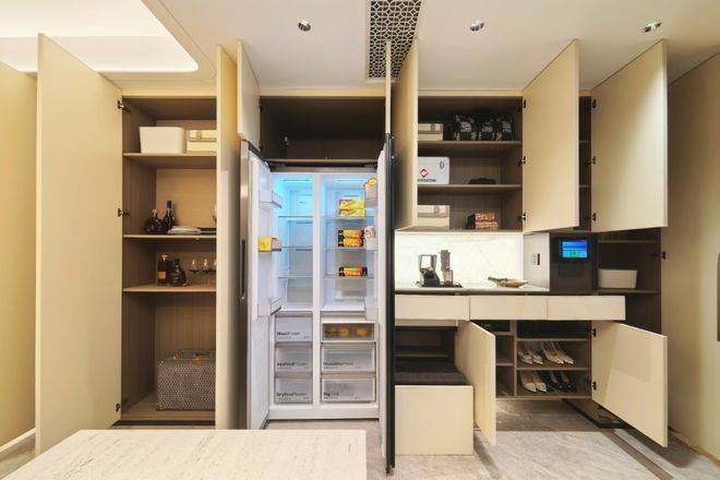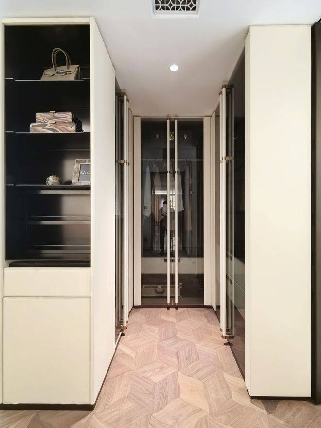 通过示意图我们会看到,一般项目的玄关柜处于成本原因只会做到下图中间位置的冰箱位置就结束,而外滩源著在标配的双开门冰箱(小户型博世或同等品牌、大户型利勃海尔或同等品牌)左侧还额外交付有完整的储物空间:进到实地约99平样板房,整个玄关柜几乎全部都是皮质缝线包裹,细节拉满;打开柜门,内外都是皮革包裹,质感进一步提升:进到主卧,L形衣柜同样是交付标准,抽屉部分和半开放水吧台位置全部都是交付标准;在全上海99%的同价位样板房里,卧室衣柜都是非交付的。在今年上半年大家都在卷人字拼地板的基础上,外滩源著主卧地板升级为柳叶拼接,进一步做了升级:看到约143平户型,厨房岛台和上柜都不稀奇,厨房外的半开放式餐边柜和利勃海尔内嵌式同样也作为交付标准附赠,柜体额外提供接近1立方面积的收纳空间:在约143平户型中,入户玄关收纳区被分为2个部分——一个是进门正对的区域,一个是进门后的步入式区域,两侧都标配有充裕的收纳空间。和约99平户型不同,约143平户型在玄关柜末端还设置有半开放水吧台,丰富生活场景:主卧和约99平户型一样,衣柜更大形成衣帽空间,还交付有半开放式、类似于酒店的迷你吧设计:现场样板房照片长这样:收纳空间全部都是来自博洛尼专属定制(或同等品牌),真正做到拎包入住、省去后期定制比价的烦恼;而在收纳空间之外,外滩源著在用料上同样可以称得上卷王——项目厨房台面是全进口的西班牙DEKTON品牌:厨房为美诺三件套交付,这和之前浦江之星保持一致;冰箱小户型为博世、大户型为利勃海尔,都是双开门设计;基础硬件都不差,项目在审美上还做了不少创新——卫生间大量采用奢石和石材,比如主卫柜体墙面就是香格里拉翡翠拼花,龙头是冷热分离式,成本更高:次卫则是采用不同风格,墙面统一采用米洞岩板、地面为深咖色瓷砖,黑金配色风格区别于看多了的海派设计,眼前一亮:卫生间下柜同样是皮革包裹交付,标配智能马桶盖板:入户玄关处的开放格背板采用罕见的白冰玉石材利用人造光源,通过石材的反射和折射,纹理清晰分明;