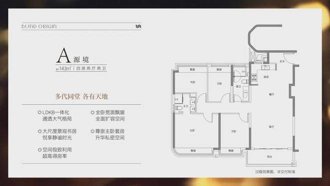 建面约143㎡户型,分为A/B户型,功能侧重完全不同。A户型是4房2厅2卫格局,三开间朝南+LDKB一体化+全卧室带飘窗+主卧套房设计+动静分离,居住功能性更强。B户型是3房2厅2卫格局,三开间朝南+LDKB一体化+奢阔宽厅+全卧室带飘窗+主卧套房设计+动静分离+主卧270度飘窗,舒适度更高。(以上仅供参考,具体请以开发商发布为准)