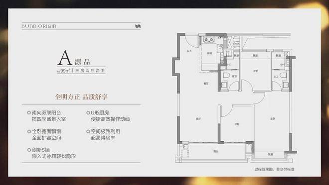 建面约99㎡3房2厅2卫,非常标准的动静分离、三开间朝南户型。"分户s墙"设计在分户墙处增设“凹型空间",“冰箱外移"增加厨房操作台面和收纳空间,创造更合理的餐厨桌台动线。三开间朝南+南向双阳台设计+全卧室带飘窗,为整个户型带去非常出色的采光,同时室内视野的延展性很强。动静分离则是把功能区与休息区分割,加上主卧套房的设计,让业主有更好的私密性和生活舒适度。