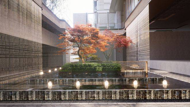 下沉庭院整体长约18米,进深约9.5米,庭院的上下景观通过水帘相连通,中间结合有着层层叠水的水景,搭配水晶砖的景墙,将品质感拉满。
