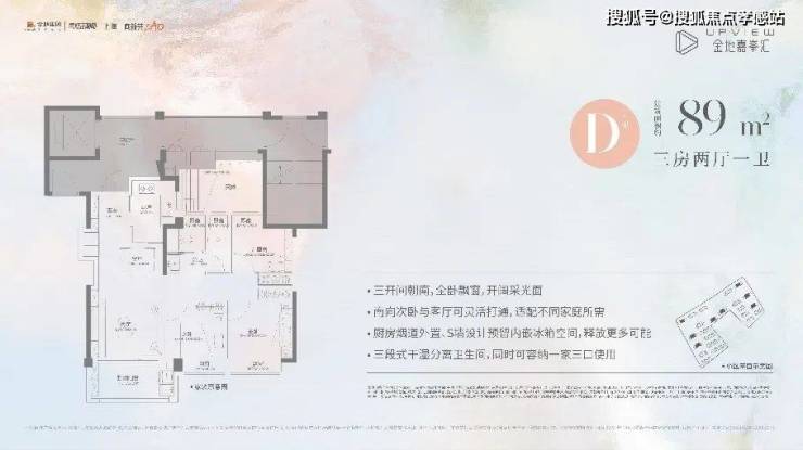 建面约89㎡三房两厅一卫(D户型),不仅功能完备,而且很好地把控了总价,约350万起即可上车高配品质三房,堪比市场上110平左右的空间感!