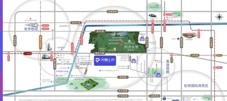 项目位于曹安路,为东西向重要干道四通八达,快速接驳沪嘉高速公路、沪宜公路、外环高速公路、中环路等多条黄金动脉链接市区及周边城市;本案距离地铁11号线上海汽车城站约3.5KM,快速高效通达市区