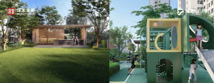 宝妈带娃有儿童活动区,滑滑梯、大草坪一应俱全!