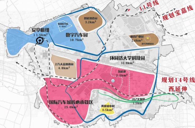嘉定新城立足打通长三角一体化和虹桥国际开放枢纽的链接通道,构建“一核一枢纽、两轴四片区”的规划新格局。“一枢纽”即安亭枢纽——以安亭北站、安亭西站为核心,无缝连接虹桥国际开放枢纽,打造站城一体化、辐射长三角的综合交通枢纽。(信息来源:《嘉定新城总体城市设计》)