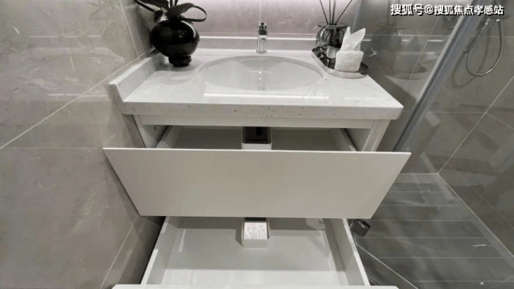 卫生间洗手池下的空间向来是卫生死角,还有弯曲的水管绕来绕去。项目却别出心裁地将这个死角做成了储物柜,充分利用空间。