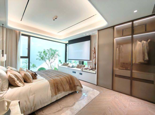主卧套房式设计+带独立衣帽间+270度转角飘窗,尊崇感与私密性拉满。