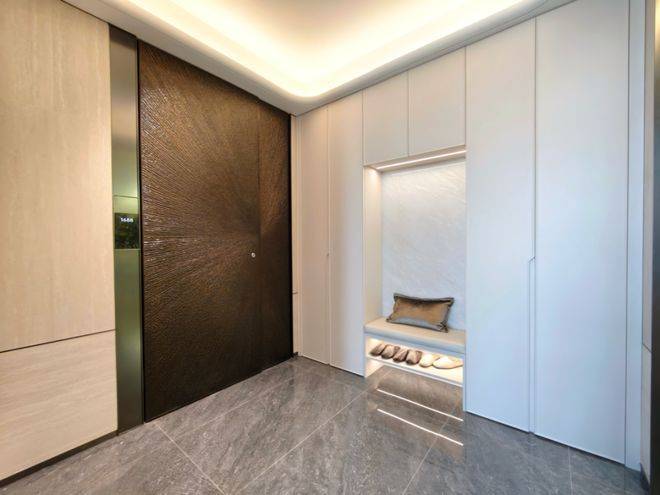 类一梯一户的设计,门口带有一个巨大的电梯厅空间,业主可以利用成为收纳空间。入户后,是一个独立玄关+800库设计,让业主常用物品(洗衣机、清洁工具等)有了绝佳的放置位置。