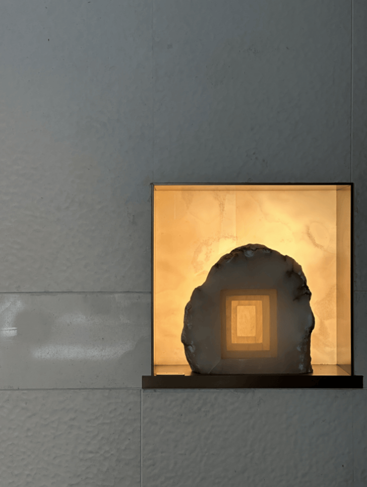 壁灯的质感,就如同摆放的西班牙云石一样,拥有粗粝的质感,又拥有几何形状的深邃,张力非凡。