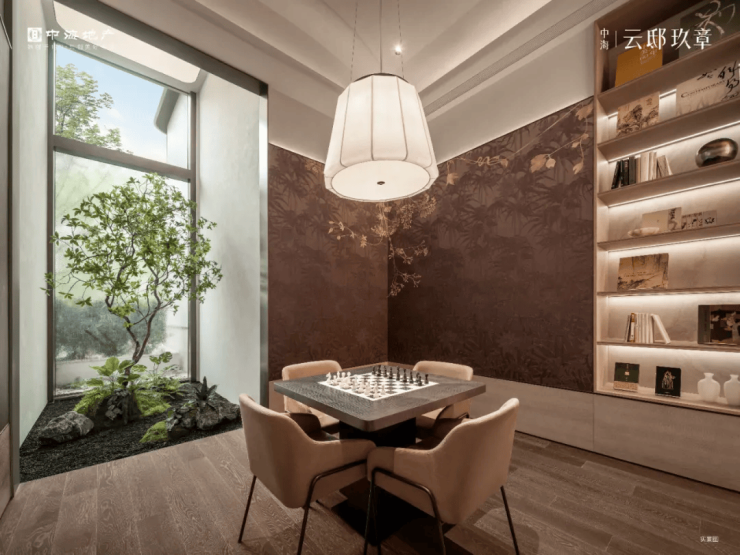 未来业主在此休憩会客,点一杯咖啡或者红酒,可以感受窗外的流水潺潺和鸟语花香。